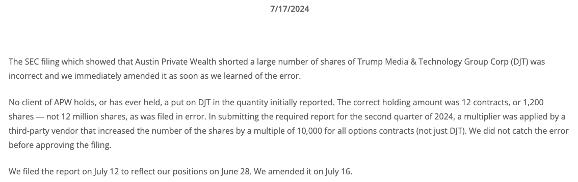 Austin Private Wealth LLC hizo el 12 de julio una enorme apuesta contra las acciones de Trump Media & Technology Group Corp (DJT) del presidente Trump.