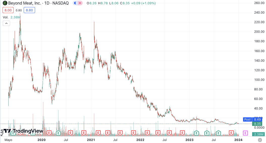 A pesar que los reguladores tienen como objetivo eliminar el consumo de carne, la empresa de carne sintética cofinanciada por Bill Gates, Beyond Meat, acumula una caída en bolsa del 96% en los últimos años.