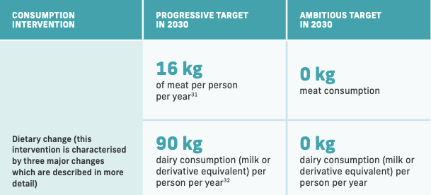 Como objetivo progresivo, reducir consumo de carne a 16kg por persona al año. El objetivo ambicioso es de eliminar completamente el consumo de carne y lácteos.