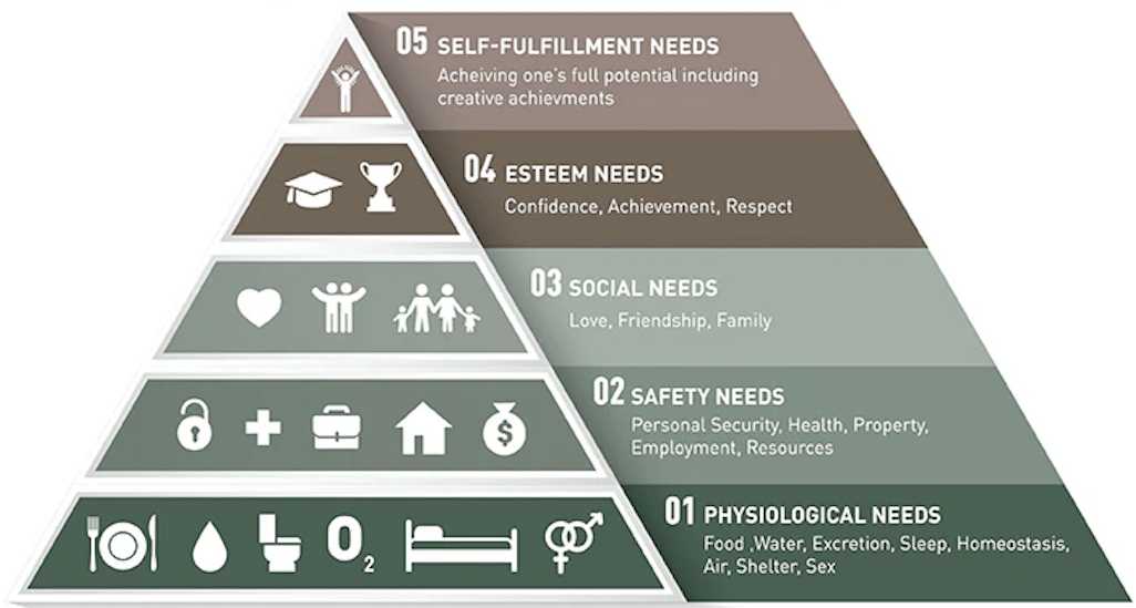 Abraham Maslow representó en una pirámide la jerarquía de las necesidades humanas, situando en la base las más básicas para la supervivencia y subiendo hacia las más complejas llegando a la autorrealización.