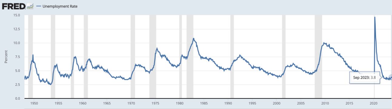 La tasa de paro se sitúa en un 3,8%. Buenos números, mostrando mucha resiliencia. Sin embargo, antes de las recesiones (bandas grises) puedes ver que el paro ha estado en niveles bajos, por lo que no hay que tomarlos con euforia.