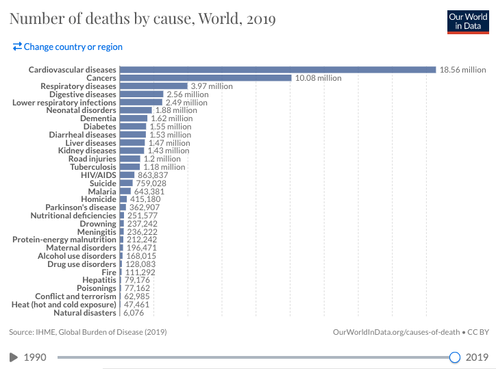 La primera causa de muerte en el mundo (2019) y de forma destacada es la enfermedad cardiovascular (+18 millones). La literatura científica ha observado formas sencillas de prevenirla (ejercicio físico y nutrición saludable). Así que ya conoces la “medicina”, no tiene patente y además aún no lo han prohibido.